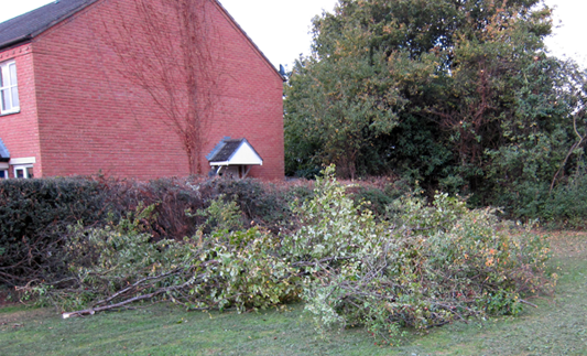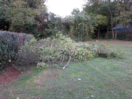 It is now 5.50 on Monday 26th and it looks like nobody came today, so all the cut branches are still there. They have been scatterred around over the weekend, by kids I think, so I have put them back into a neat pile.