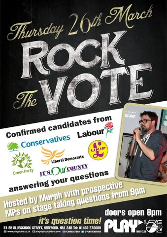 I hope this is Ok to post Colin. Thursday 26th March - doors open at 8pm Play is hosting a "Rock the Vote" The idea is simple - all the major parties have been invited, Conservatives, Labour, Lib Dems, Greens, UKIP, Its our County - all have replied and confirmed attendance. This is an "open Question Time" style of discussion from 9pm in the club. So - if you are interested in Politics, care about who should be the next MP for our great City but unsure who to vote for, this could be the place to help you decide! Candidates take to the stage at 9pm. IF you have a question you wish to ask - please feel free to post here, and Ill add it to the mix and report back the answers if you cant make the event.