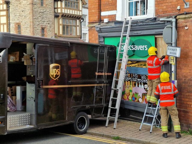 'Should Have Gone To Specsavers' 🤓 Photo courtesy of Chris Powell On a serious note, a UPS Van has made contact with Specsavers unit in Ledbury. Fire crews from Hereford & Worcester Fire and Rescue Service are currently dealing with this incident. There are no reports of any injuries thankfully.