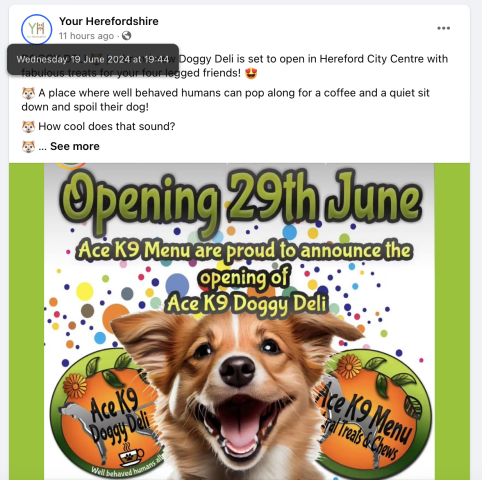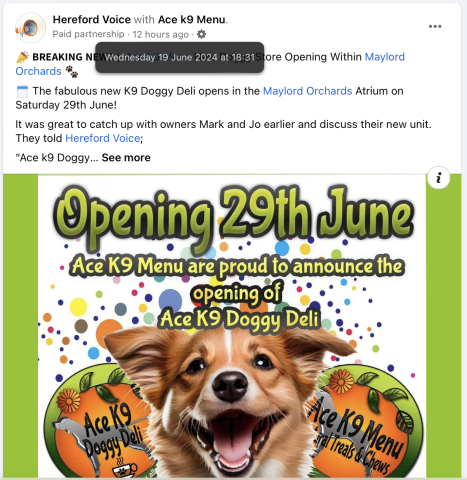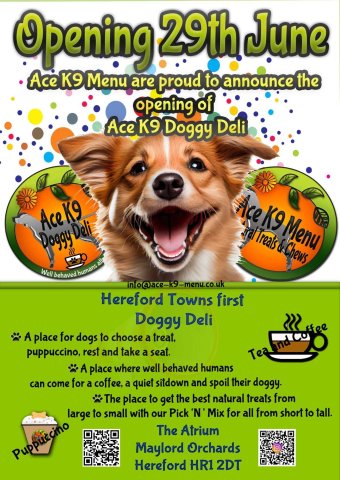 The fabulous new K9 Doggy Deli opens in the Maylord Orchards Atrium on Saturday 29th June! It was great to catch up with owners Mark and Jo earlier and discuss their new unit. They told Hereford Voice; "Ace k9 Doggy Deli will be selling natural dog treats and chews and some dog related accessories. We will be providing tea, coffee and some cakes (for humans haha) and puppucinno's for the doggies and some freebie treats. So hoping it will be a success as we are fully aware of footfall in this location. As im sure you are aware Maylords isnt visited as much these days due to closure of Wilko etc. Mark and I so want to make the Atrium at Maylord Orchards a vibrant shopping centre again. Fingers crossed it will entice other retailers in with the other units opening soon. Just need Hereford peeps to support it. This is a 13 week pop up at the moment but so hope we get the support and we can make it permanent. At the moment we have a permanent position at Hereford High Town Market on a Saturday this has proved very popular and successful. We are so excited and can't wait to open on Saturday 29th June" Web | https://ace-k9-menu.co.uk 𝗥𝗲𝗺𝗲𝗺𝗯𝗲𝗿 𝗪𝗵𝗲𝗿𝗲 𝗬𝗼𝘂 𝗛𝗲𝗮𝗿𝗱 𝗜𝘁 𝗙𝗶𝗿𝘀𝘁! Hereford Voice wish Mark and Jo the very best of luck with their new venture!