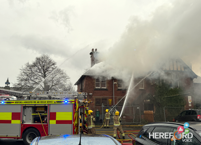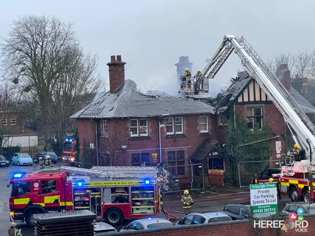 A fire ripped through the old NHS derelict building on Eign Street in Hereford this evening. The were several appliances and firefighters tacking the blaze at one point. Firefighters took a while to get the fire under control which has causes further substantial damage to the building and roof. There have been a few fires in this building over the years and since it became derelict.
