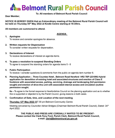 An Extraordinary Meeting of the Belmont Parish Council will be held at the Kindle Centre (Asda) on Thursday 5th May 2022 at 7.30pm to discuss and agree a formal response to the Three Counties Hotel Hybrid application for demolition of existing hotel and build a Lidl Supermarket.