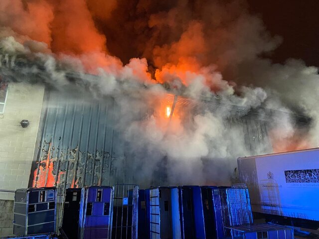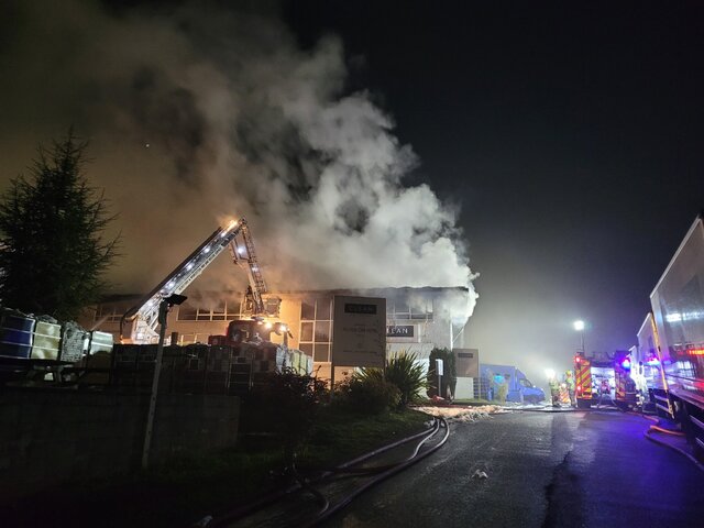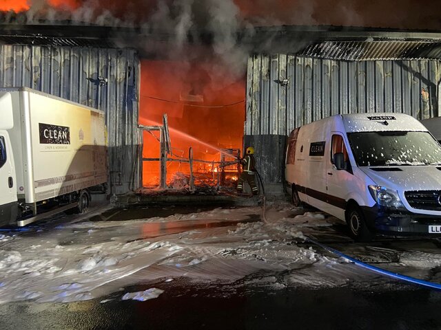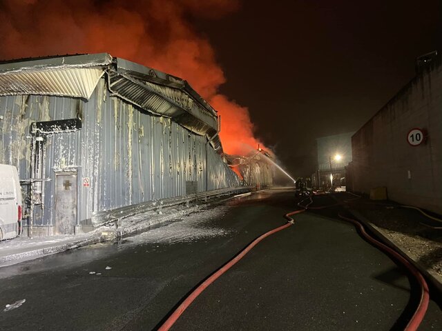 Multiple fire crews are in attendance this morning at Large factory fire at Overross Industrial Est, Ross on Wye in #Herefordshire. Photograph courtesy of Ade Farmer (Group Commander HWFRS) Hereford & Worcester Fire and Rescue Service have 10 appliances on site with support from South Wales Fire and Rescue Service. Great effort from all crews especially the first pumps from Ross-on Wye-Fire Station who established a sound IC structure. Photograph courtesy of Ade Farmer (Group Commander HWFRS)