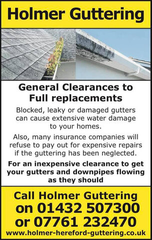 16. Holmer Guttering - 07761 232470 IMPORTANT INFORMATION: Insurance companies may not pay out if gutters are full as it is considered negligence. Deposits such as moss, dirt, grit mud, grass, leaves, twigs and plants can cause the gutters to become heavy and break away from the wall causing extensive damage. Even worse, damp in walls caused by the gutters not draining water can be a very expensive fix. Gutter cleaning is an essential part of property maintenance. At Holmer Guttering will not only clear all your gutters and down pipes they also rinse the gutters through leaving no unwanted deposits. For a free quote phone : 01432 507300 or 07761 232470