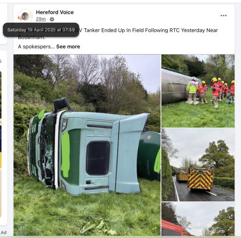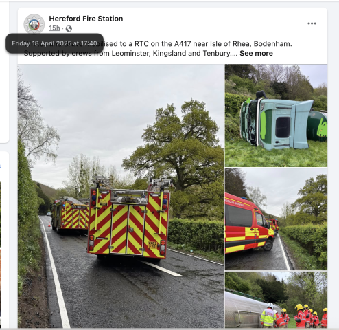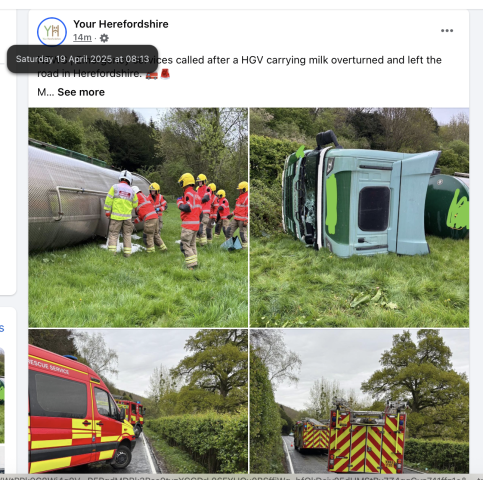 A spokesperson for Hereford & Worcester Fire and Rescue Service told Hereford Voice "Whites and Bravo mobilised to a RTC on the A417 near Isle of Rhea, Bodenham. Supported by crews from Leominster, Kingsland and Tenbury. One artic wagon carrying a large quantity of milk had left the road and came to a rest in a field. Crews used our environment agency grab pack to initially reduce the spillage before the Environmental Protection Unit from Tenbury arrived. Thankfully no serious injuries. Incident left with the police for investigation and recovery" 📷 HWFRS