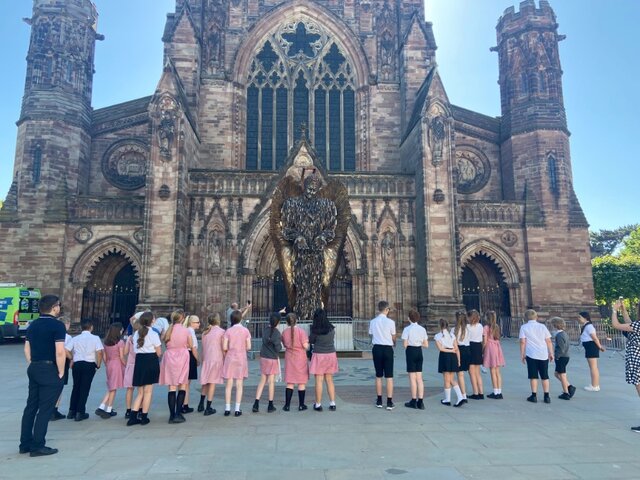 A large group of children from St Thomas Cantilupe Primary School visited the thought-provoking Knife Angel Hereford statue at Hereford Cathedral, a quote on the schools Twitter page simple read;