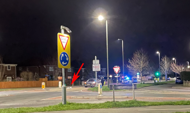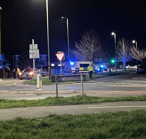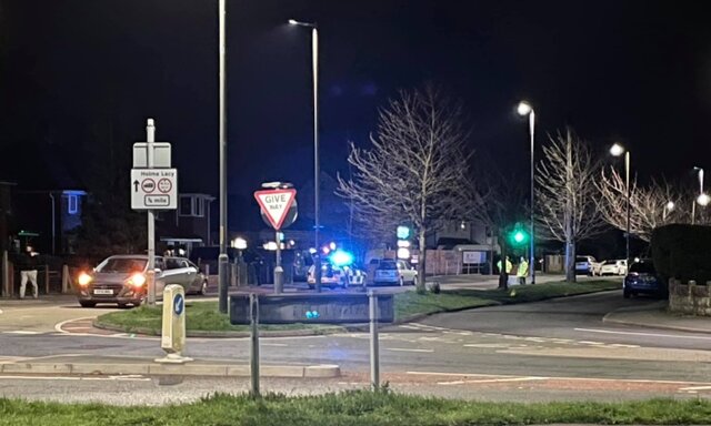 There is a large Police presence tonight on Holme Lacy Road in Hereford. The road is currently closed at the roundabout near to the Co-op due to an ongoing incident. There is a large Police presence at the scene and a silver Hyundai is parked with its hazard lights flashing within the police cordon. There is an object on the road in front of the Hyundai which the Police have covered with plastic sheeting to preserve as possible evidence.