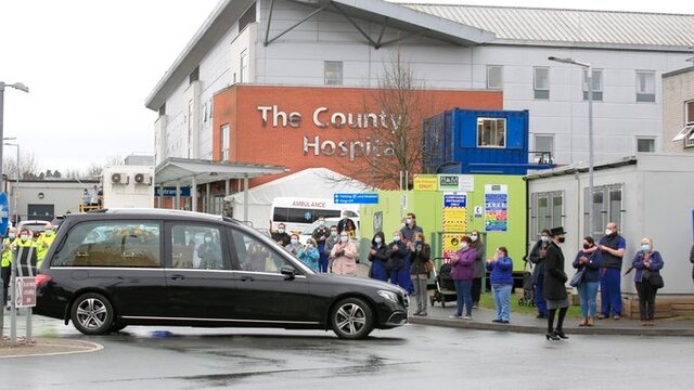 Hundreds of staff paid tribute to a much-loved colleague at Hereford County Hospital this morning. Theatres logistics manager Dave Morgan died in January after testing positive for Coronavirus. Members of the WVT family lined streets clapped in tribute as the cortege passed. -