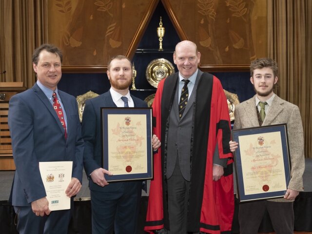 Max and Simon in the Masons' Yard (2019) Simon Hudson, of Hudson Stonework Ltd based in the Cathedral Close, has been awarded 'The Master Craftsman Certificate' by The Worshipful Company of Masons in 2021. Simon in the Masons' Yard With over two decades of working as stone mason and carver in Herefordshire, Simon’s work can be seen not just at Hereford Cathedral but also many churches and heritage sites within the county and further afield. Hudson Stonework Ltd has been a resident of the Cathedral Close for ten years and its location means that the art of this traditional craft can be shared with all who pass by. The Masons’ Yard provokes much interest from visitors to the cathedral and it is not an uncommon sight to see Simon explaining his latest project or answering questions from those who have stopped to watch him at work. Alongside his work Simon has shared his wealth of knowledge, gained over almost 40 years, and trained two apprentices who have both received national recognition as a result of his mentoring. Alec Curtis and Max Cotterill received The Journeyman Certificate and The Apprentice Certificate respectively from The Worshipful Company of Constructors in 2019, making this latest award a hat trick of success for the company. l-r Simon Hudson, Alec Curtis, Mr Terry Withers FRICS & Max Cotterill c. Phil McCarthy receiving awards in 2019 The Revd Canon Andrew Piper, Precentor & Acting Dean at Hereford Cathedral, said, “The Chapter offers Simon our warmest congratulations on being awarded The Master Craftsman Certificate in recognition of his dedicated and exceptional work. It is a rare privilege for us to have such a skilled stonemason based in the Cathedral Close, and it is a pleasure to watch him practise and teach his craft on a daily basis. The work of Simon and his former apprentices can be seen on the cathedral and many churches across our diocese and beyond it: we all value their expertise, and we appreciate their friendliness and generosity in sharing their talent and enthusiasm with us. It is a delight to have Simon and his apprentices as part of our cathedral community.” The Worshipful Company of Masons is number thirty in the order of precedence of the Ancient Livery Companies of the City of London, as set by the Aldermen of the City in 1515. Their focus is to preserve and encourage the use of natural stone in the built environment, including supporting the training of craftsmen as well as the preservation and appreciation of iconic historic stone buildings. The Worshipful Company of Masons is at the forefront of supporting the craft of stonemasonry in education and preservation.