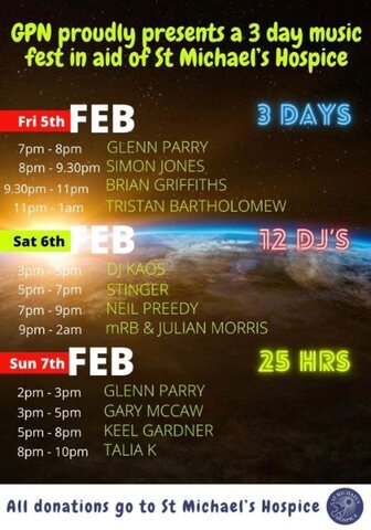Today is 'World Cancer Day', please spare a thought for all those people that are suffering with cancer and let us also celebrate the fantastic work done to help help millions of people around the World who also survive this horrible disease. Locally we are supporting St Michaels Hospice and their '3 Day Music Fest' so while we're not allowed to go to any live music events, Hospice supporters Julian Morris and Glenn Parry are lifting our spirits by staging a virtual, online, 3 day dance music festival, with donations going to St Michael's Hospice. 3 Days, 12 DJ's, 25 hours of music. Friday 5th/Saturday 6th/Sunday 7th February, 2021. Featuring DJ sets from Glenn Parry, Simon Jones, Brian Griffiths, Tristan Bartholomew, DJ Kaos, Stinger, Neil Preedy, mRB & Julian Morris, Gary McCaw, Keel Gardner and Talia K. All streamed live on mixcloud.com For more information and to donate visit the JustGiving page: https://bit.ly/3pCb7Qi
