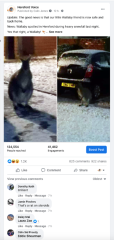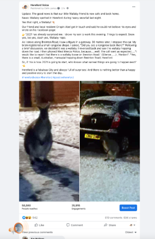 Incredible Stats of our Facebook page with our story today about our little Wallaby friend has reached almost 60,000 people in less than 2 hours! WOW! We rarely publish statistics but just wanted to highlight the reach of social media with warm charming articles like this. We all love a great story and this one was no exception. There is something delightful and contagious about being 'positive' and having lovely stories to write about. Our fabulous city of Hereford often surprises us with some great news subjects like this one. This story has captivated so many people today, we have reached almost 60,000 people in less than 2 hours with virtually 26,000 engagements and over 900 likes, 600 comments and nearly 700 people have shared our story. There is a lot of sadness and uncertainty in the World at the moment but we're loving this window of 'Positive Hereford' today. Have a great day folks and keep those stories and photographs of this fabulous city of ours coming our way. #herefordvoice #positivehereford #hereford- 7 replies