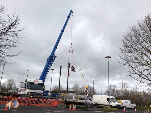 If you're living in the Belmont area and are wondering what the huge crane is being used for this morning, it is for the new installation of a 16 metre phase 8 pole with wrap around cabinet built around the base with new equipment cabinets and ancillary development for EE and HG3 on the land adjacent to Tesco Belmont.