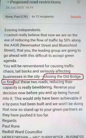 A different perspective .... We have acquired an email sent from Cllr Paul Rone to the 'Independent Group' who hold the largest coalition majority at Herefordshire Council. As you will see in the email he sent on the 28th of July below Councillor Rone says 👉"Closing The Old Bridge Is Fine" 👈 in Hereford however, just a few days later on August 1st in this video published by our friends at Your Herefordshire, he says something completely different... Cllr Paul Rone owns several businesses in Hereford including the Saracens Head Pub where the footpath running along the side of the river remains closed to the public, he also owns his own city taxi. As you know Hereford Voice are very supportive of our local businesses and it’s great to see the recent reports showing footfall has increased in the city. The statement signed by some businesses today about a vote of no confidence, talk about years worth of vanity projects, so is it really fair to blame everything on an administration who have only been in for less than a year. In recent days this story 👉 https://hfd.news/vdo of a road project hit with procurement snag was published by our friends at Sunshine Radio - Herefordshire Council leaders have revealed a procurement failure meant they would not have been able to award the contract to build the £27m southern link road in Hereford. People might not like these new temporary changes which the Government have asked all councils to look at it but at least Herefordshire Council are being honest and transparent about their projects. Online shopping has increased massively across the UK and as a result shops all over the country are closing, it’s not about people not being able to get into the city, it is that many people feel safer shopping online. So regardless of the emergency measures currently in place in Hereford, footfall is increasing, so clearly people can get into the city. What are these businesses and others going to do to attract people into their shops? You simply can’t just blame the council, who to be fair, cannot force people go into shops. #HerefordVoice #HerefordNews