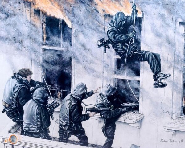 On This Day: 40 years ago today saw the Iranian Embassy Siege brought to a dramatic end with 'Operation Nimrod' successfully executed by the Special Air Service (SAS). Also discussed HERE 'The Back Door' depicted in this painting by John Tidewell "Who Dares Wins"
