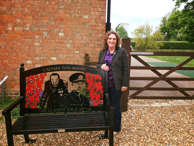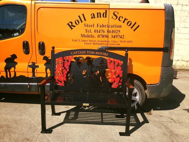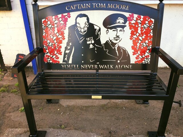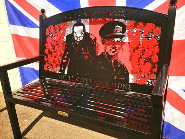 Steel Fabricators 'Roll and Scroll' based in Grantham, Lincs have honoured Captain Tom Moore by manufacturing this stunning bench, which they have kindly gifted to him for his 100th Birthday. Captain Tom's daughter Hannah is pictured here accepting the bench on her fathers behalf, he was resting at the time when the bench was delivered to his home by Managing Director Chris Kennedy. The bench features beautifully crafted images of Captain Tom Moore together with his name and with the words 'You'll Never Walk Alone" at the base. This is such an unselfish and kind gesture from the firm who have manufactured over 100 memorial benches so far. Thank you to Chris for these lovely photographs, which we have pleasure in sharing and we're sure that Captain Tom Moore will be absolutely delighted with his birthday present.
