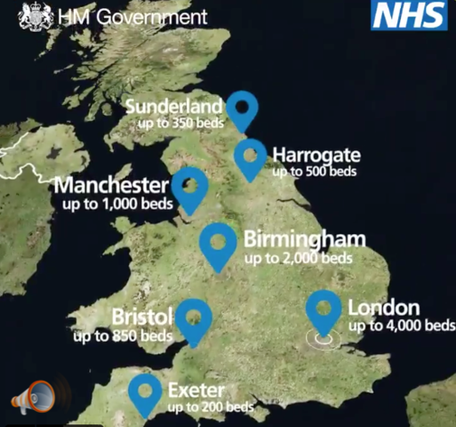 The NHS is opening seven new hospitals across the country to fight Coronavirus. London 4000 beds Birmingham 2000 beds Manchester 1000 beds Bristol 850 beds Harrogate 500 beds Sunderland 350 beds Exeter 200 beds These sites will provide hundreds of extra beds to help make sure the NHS capacity remains higher than required during the peak of the #Coronavirus.