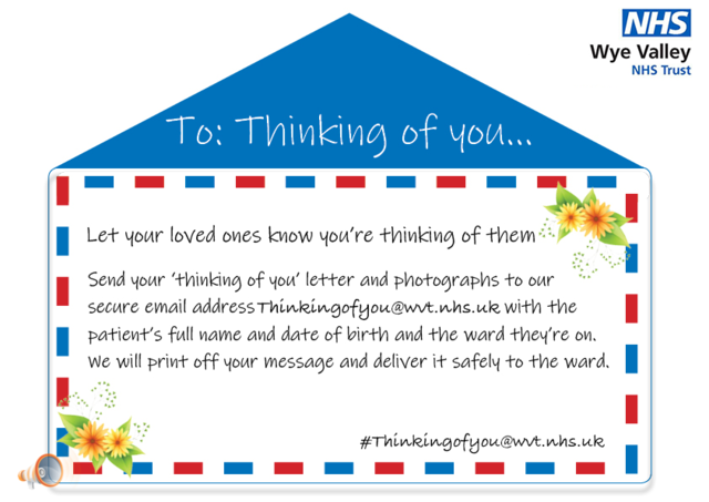 'Thinking of you’ service set up for loved ones to keep in touch with patients There was no image, so we have created this one which has been endorsed by the trust for us to use. A new ‘thinking of you’ service has been set up for loved ones to keep in touch with patients staying in hospitals across the county, whilst ward visiting remains suspended. Wye Valley NHS Trust has introduced the new service to help keep patients and their family and friends in contact with one another during Covid-19. The service is available seven days a week and messages will be delivered by hospital staff to patients on the wards at Hereford County Hospital, Leominster, Bromyard and Ross Community Hospital. Catherine Davies, associate director of nursing at Wye Valley NHS Trust, said: The relative of a Trust patient said: What you need to do to send a message to your loved one: Choose one family member or friend to send the letter Include the patients full name, date of birth and ward/department where they are an inpatient Email the letter and the above details to Thinkingofyou@wvt.nhs.uk