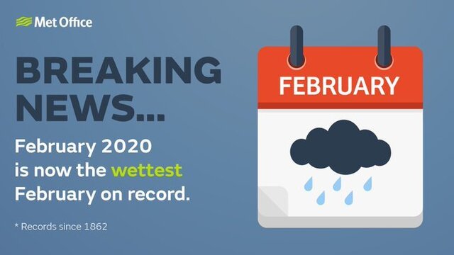 The Met Office have just confirmed it's the wettest February on record! Latest rainfall data (up to 9am 29th Feb) reveals that FebruaLatest rainfall data (up to 9am 29th Feb) reveals that February 2020 is now the wetttest February on record A UK average of 202.1mm has fallen, beating February 1990 where 193.4mm fell.