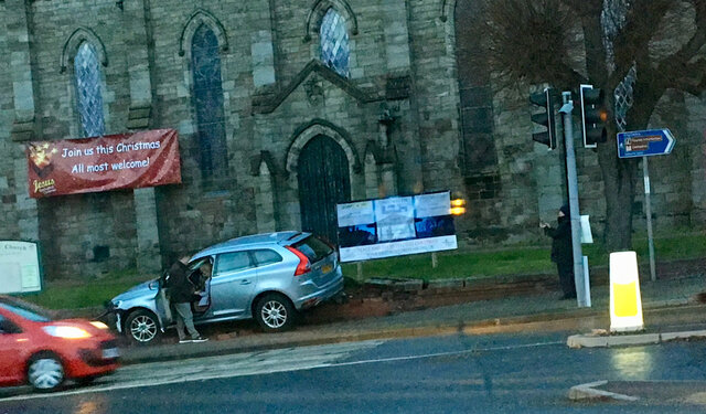 A Volvo car has crashed into the wall at St Nicholas Church in Barton Road this afternoon. We are not sure how the vehicle managed to crash into the wall with the car facing in the wrong direction...We understand that an elderly couple were in the car. There is a recovery truck on site and we do not believe anyone was seriously injured. So our question now is should people have a mandatory re-test every two or three years once they reach the age of 70-75?