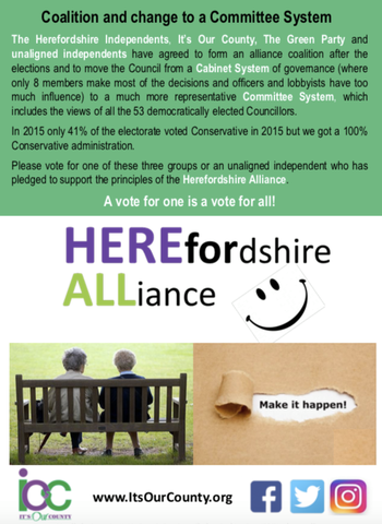 Well yes, but this 'official' explanation says otherwise - unaligned Independents should be playing nicely with Herefordshire Independents. Guess Kenyon plays by his own rules. They've all had long enough to sort this out - IOC lost seats at the last election because they weren't organised in time and they've all had another 4 years to get their stories consistent. Poor proof reading as well (govemance - is that a love-in with the Gove?).