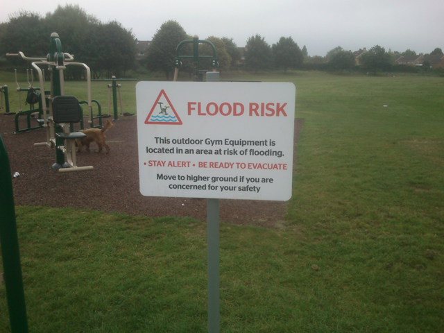 It really is a complete waste of money. This part of the field does flood... But only very occasionally (possibly twice since 1990?) But it takes a good, long, proper amount of rain, and even then it doesn't go from: Dry... Dry... Dry... Dry... Dry... BIT WET... DANGEROUSLY FLOODED, HELP, HELP! There would be no way that you'd be pushing out the strokes on the rower and suddenly be in danger and need a real boat! It's mad. somebody has kindly tied a bin bag to the sign at the moment, so at least it is being useful now, but change it for a bin! Get rid of the sign ad put a bin in its place! Blimmin' flood sign... It's mental! Ooh, can I say: "It's health and safety gone mad!" Yes! Awesome! -