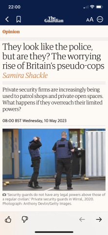 It’s seems that there are private security personnel patrolling around the Mayfair…who’s employing them & paying for it…is this not the job of the police to do?….another question is could this be the future for our streets on a Friday & Saturday night where private security firms deal with the anti social behavior that sometimes occurs on city streets at the weekend instead of the police?